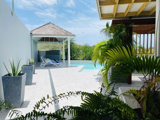 The swimming pool and pergola have ocean views towards Falmouth bay and evening sunsets can be enjoyed while relaxing in comfortable garden furniture.
